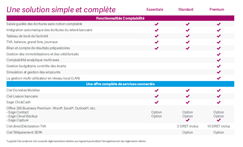 Ils vous sont proposés par catégorie: Comptabilité, Gestion Commerciale / Facturation, Solution « 2-en-1 » (Facturation + Comptabilité), Paye, Fiscalité, Auto-entrepreneur / Profession Libérale, Association, Enseignement et autres logiciels Ciel.