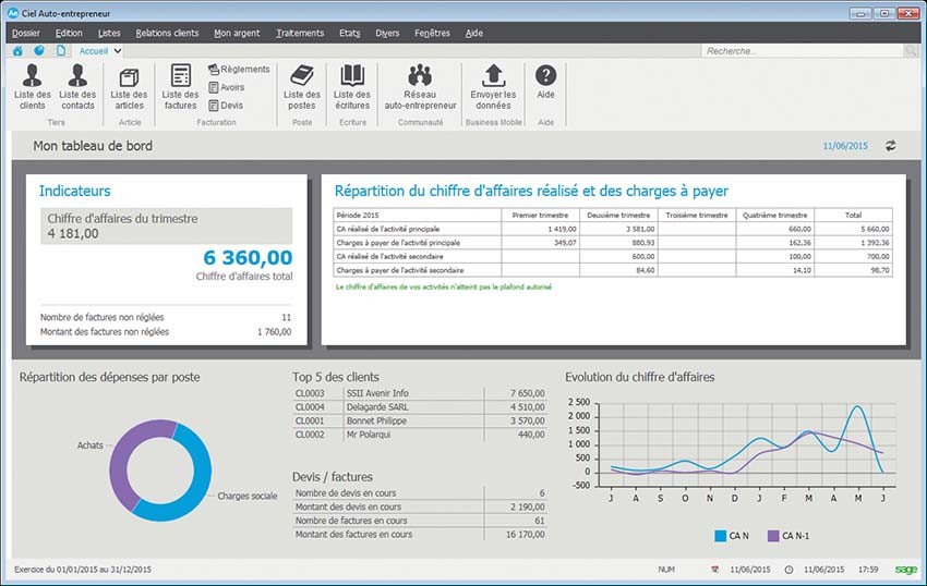 - Visualisez d’un coup d’oeil les chiffres clés de votre activité grâce au tableau de bord intégré (CA, Top 5 clients…) !