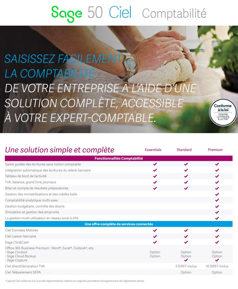 Pour répondre précisément à vos besoins, Sage 50 Compta se décline en 3 versions : Essentials, Standard et Premium. Vous trouverez le tableau de comparaison en bas de page.